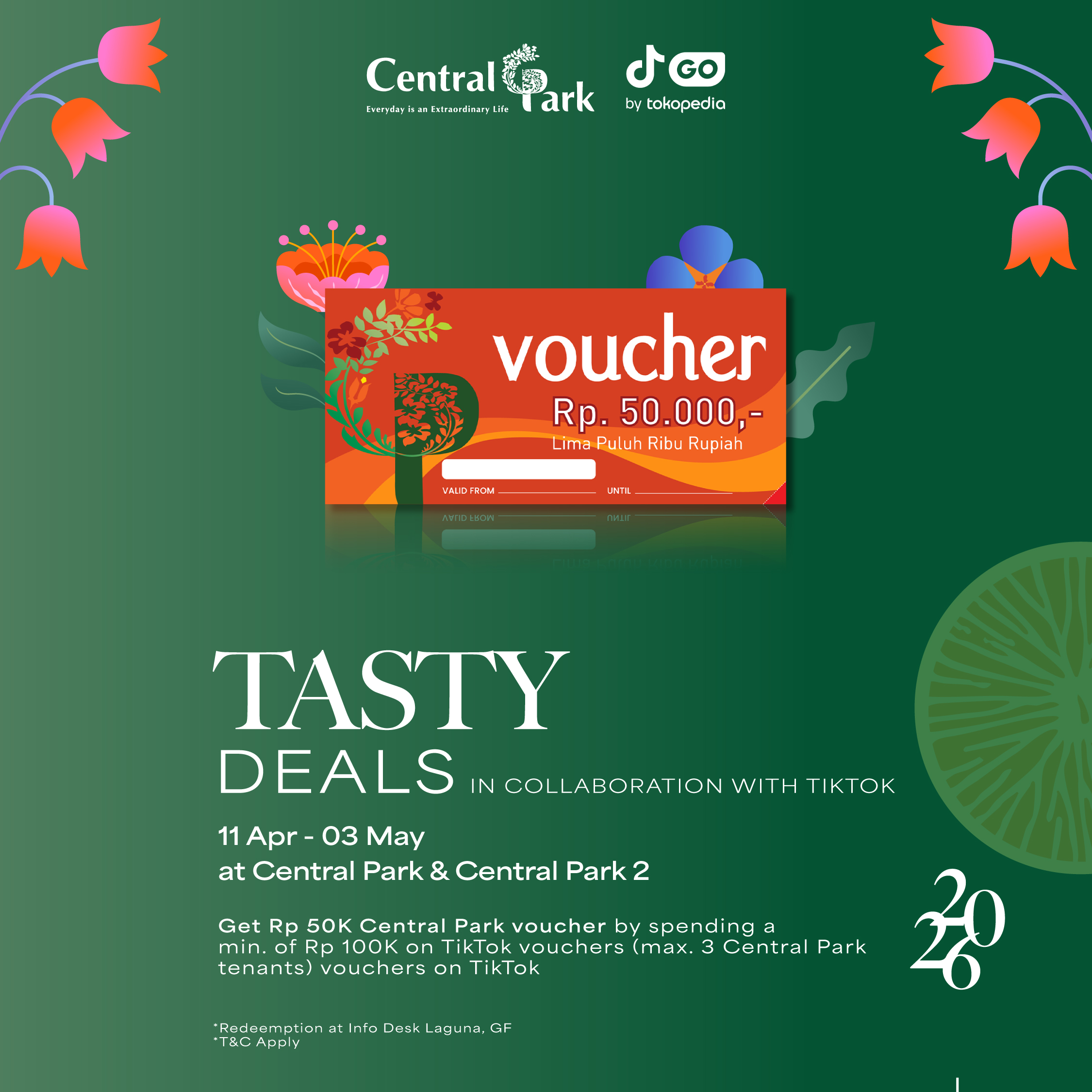 Get a Rp 50K Central Park voucher by spending a minimum of Rp 100K using TikTok vouchers (max. 3 Central Park tenants’ vouchers on TikTok)